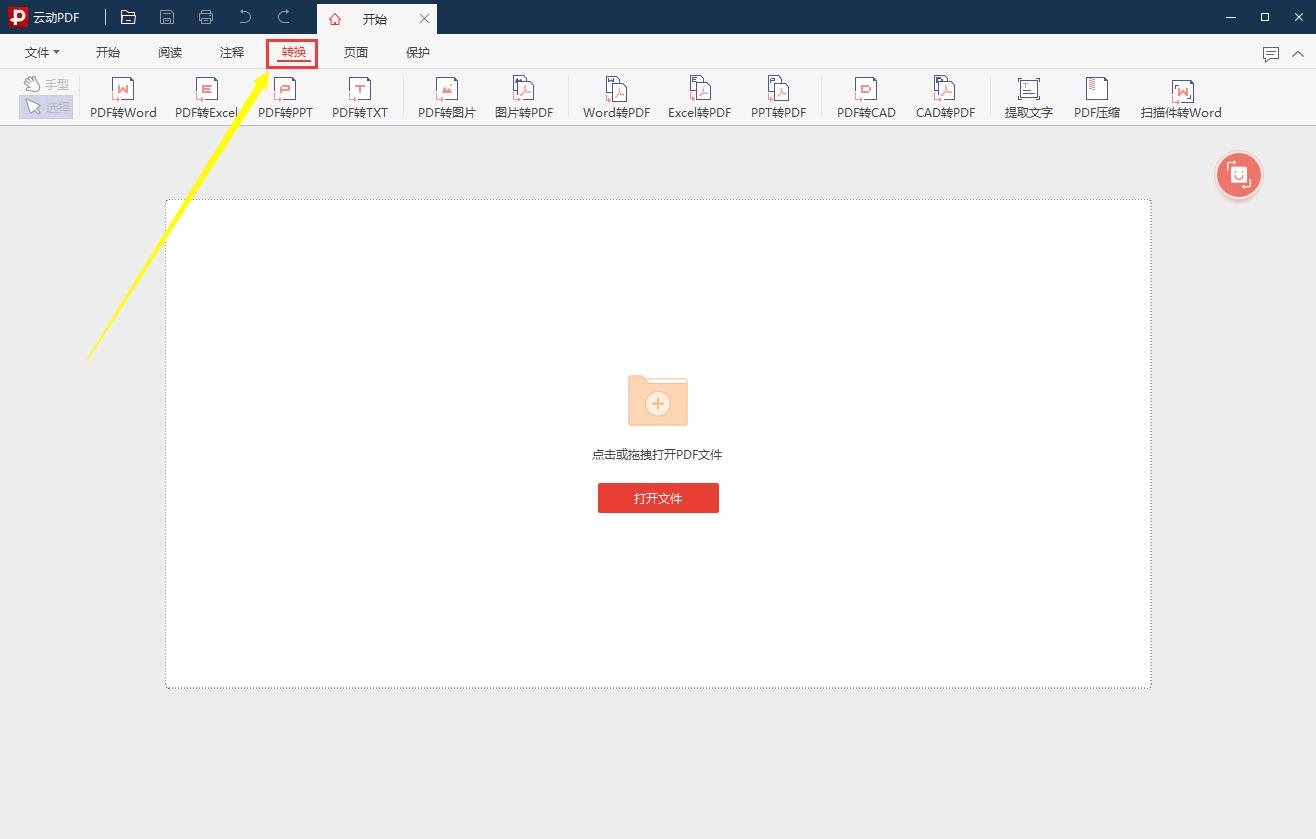 2、如需转换PDF文件我们选择“转换”功能即可,点击“打开文件”按钮从电脑文件夹选择文件,或者直接拖拽文件到软件界面。