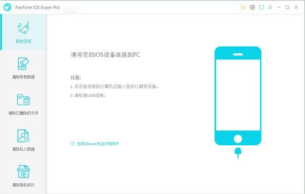PanFone iOS Eraser P最新版是一款专业的IOS数据擦除软件,PanFone iOS Eraser P最新版可以帮助用户清除IOS设备中的所有数据,从而保护用户的隐私。PanFone iOS Eraser P最新版具有简单直观的作界面,软件提供了释放空间、清除所有数据、清除已删除的文件、清除私人数据、清除隐私碎片等多种功能模块。