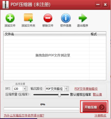 1、双击打开我们已经安装好的PDF压缩器,打开软件后就会看到如下界面,这时我们点击添加文件或者文件夹(添加文件选项:一次可添加一个文件;添加文件夹:一次可添加多个文件。)