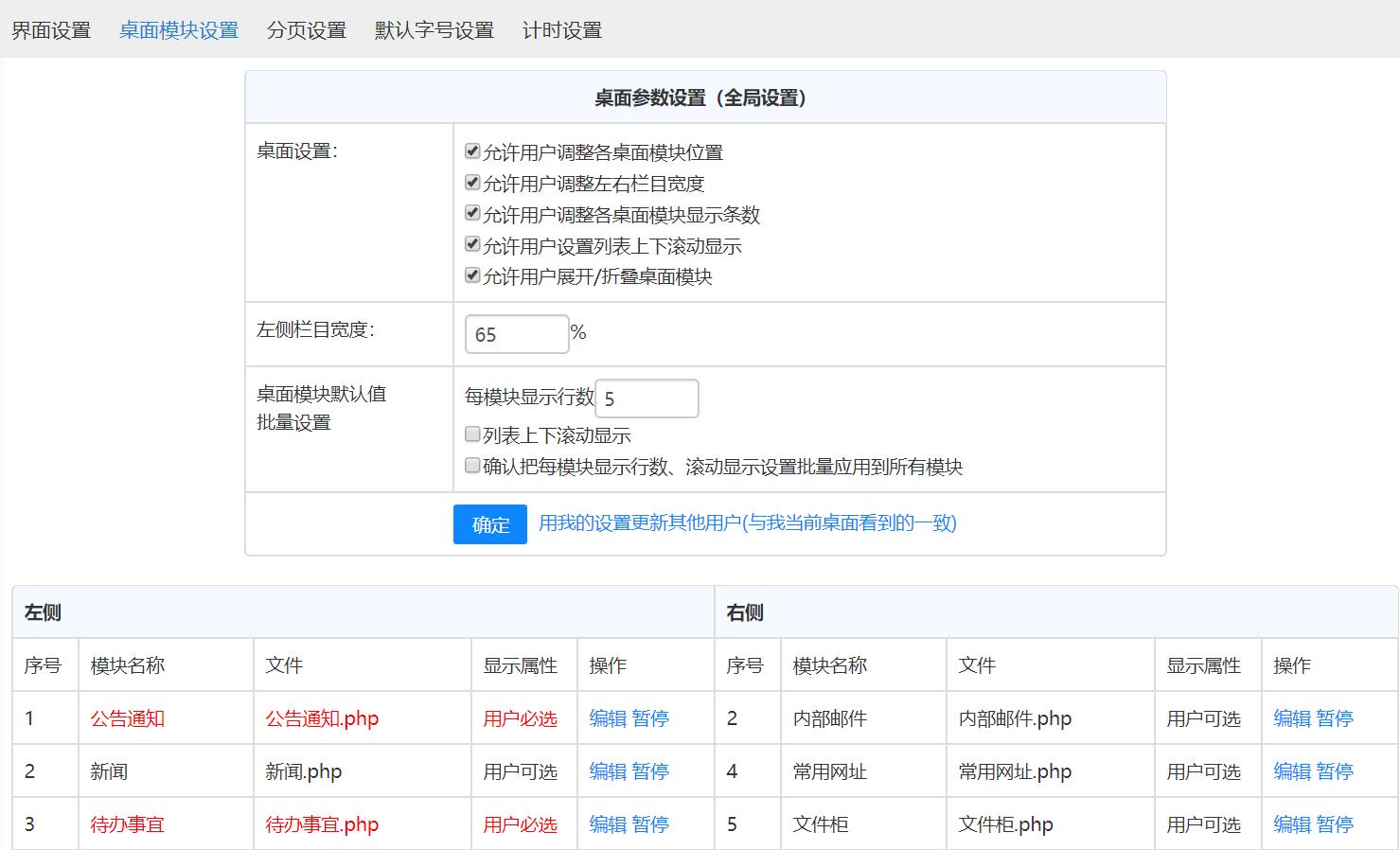 分页设置是针对系统中各个功能模块的单页显示行数来进行设定,能便于管理员将系统的内容显示设置的更加合理。